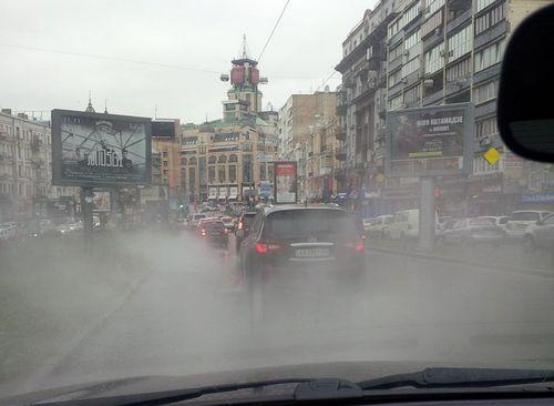 У Києві на Бессарабці прорвало трубу з гарячою водою. Окріп залив вулицю, в тому числі і проїжджу частину, тож через пару видимість для водіїв дуже ускладнилася.