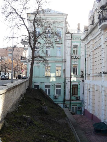 Горбистий рельєф Києва дуже часто змушував архітекторів та інженерів застосовувати різні нововведення або візуальні прийоми. Одним з результатів такої роботи і став будинок на вулиці Трьохсвятительській 11, який має різну поверховість з фасаду і з двору. З боку вулиці це абсолютно звичайний триповерховий будинок початку 20-го століття.