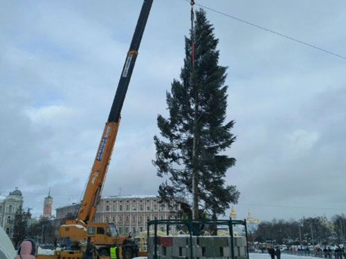 На столичній Софійській площі встановили головну новорічну красуню України. Це - 26-метрова ялина, привезена 3 грудня через Надвірнянського району Івано-Франківської області.