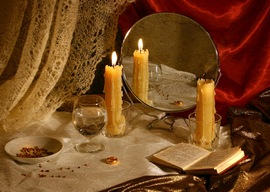 Узяти два дзеркала різної величини і поставити їх «обличчям» один до одного. Посередині треба розставити 3 запалені свічки. Біля півночі вимкнути світло, сісти обличчям до великого дзеркала і дивитись у нього поверх меншого. З цього моменту не можна промовляти жодного слова, озиратись і моргати (наскільки вистачить духу). У дзеркалі можна буде побачити щось сходе на коридор із свічками. І в цьому коридорі має з’явитись суджений. Щоб ускладнити процедуру, подейкують, що дивитись в утворений коридор треба через склянку води.