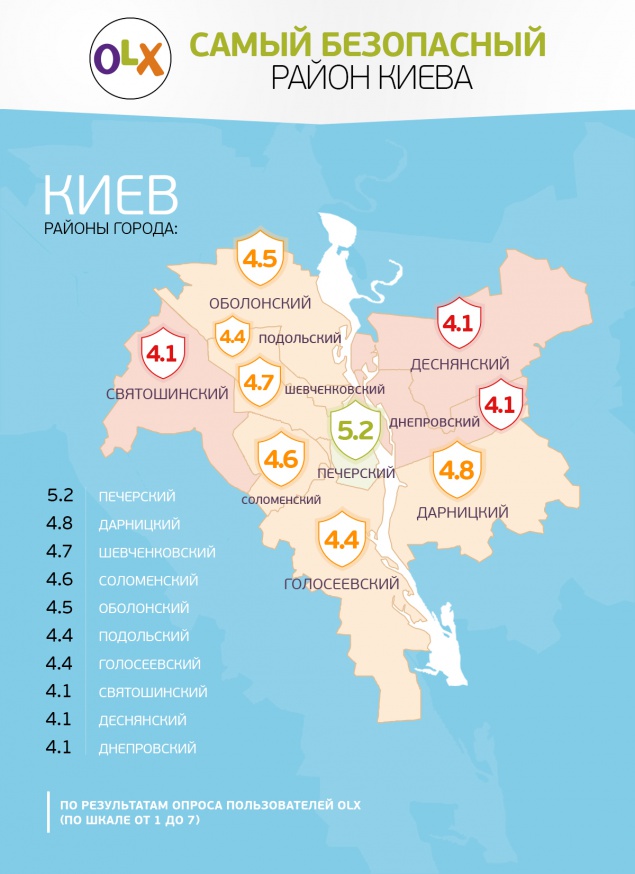 Порівняно молодий і переважно спальний Дарницький район розмістився на другій сходинці з 4,8 бала. За ним йде Шевченківський з 4,7 бала. Подільський, Солом'янський і Оболонський отримали посередні оцінки в межах 4,4-4,6 бала. Найменш впевнені у своїй безпеці жителі двох районів Лівого берега - Дніпровського і Деснянського, а також віддаленого від центру Святошино. Їх безпеку жителі столиці оцінюють в 4,1 бала.