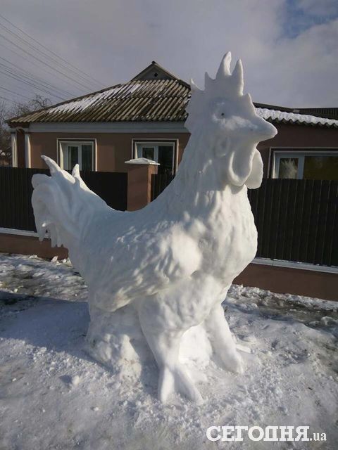 У Переяславі-Хмельницькому Київської області місцевий житель Олександр Заруба змайстрував біля свого будинку (вулиця Балаяна, 14) гігантського 2,5-метрового півня зі снігу. Символ року - як справжній, навіть курочки до нього підходять.