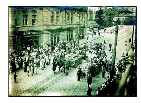 «Друзі, а зверніть но увагу на вивіску на протилежному боці вулиці. Це Київ 1920 року - процесія з гробом художника Георгія Нарбута проходить біля Думської площі (сучасний Майдан Незалежності). Фото НХМУ. Це я до фрази «Кієв всєгда бил рускоязичним». Точно, всєгда?», - зазначила вона.