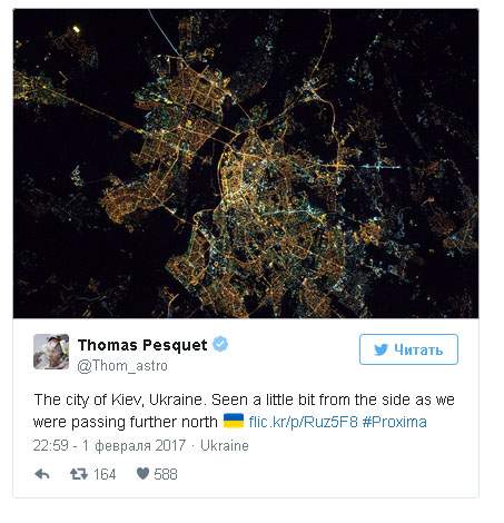 Француз Томас Песке знаходиться в космічному польоті на МКС з 17 листопада 2016 року, і постійно розміщує на своїй сторінці фотографії з Космосу і зсередини станції.