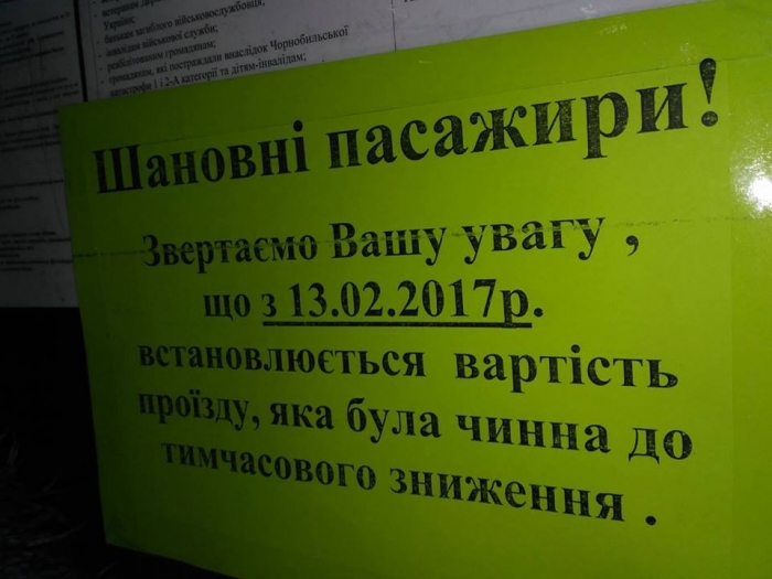 Згідно з інформацією, 6 лютого маршрутні таксі дещо знизили ціни на проїзд. Але днями у маршрутці №721, яка курсує від Києва до Вишневого, з'явилося оголошення про поверненням цін.