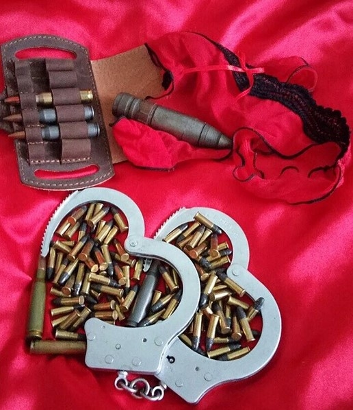 На фотографії патрульної можна розглянути жіночу нижню білизну, наручники і цілий комплект патронів різного калібру. Все це, судячи з усього, дівчина зображена на червоній шовковій простирадлі.
