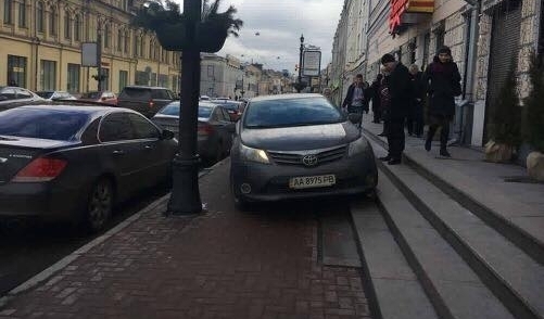 Цього разу під приціл киян потрапив власник автомобіля марки Toyota з державним номером АА8975РВ. Він припаркував свою "крихітку" прямо на сходинках біля ресторану "Варенична Катюша" на столичній вулиці Сагайдачного. Найцікавіше, що водія абсолютно не хвилює той факт, що автомобіль може комусь заважати.
