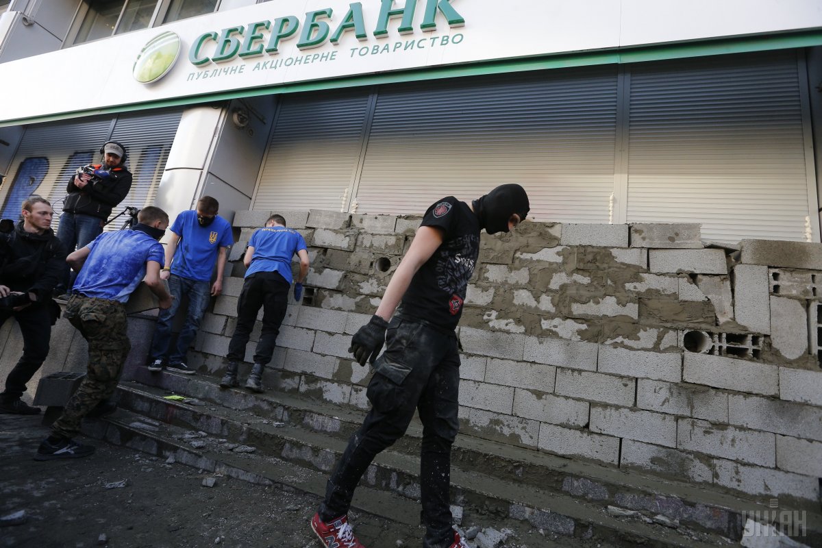 Активісти партії «Національний корпус» замурували вхід до одного з офісів «Сбербанку Росії» у центрі Києва на вулиці Володимирській.