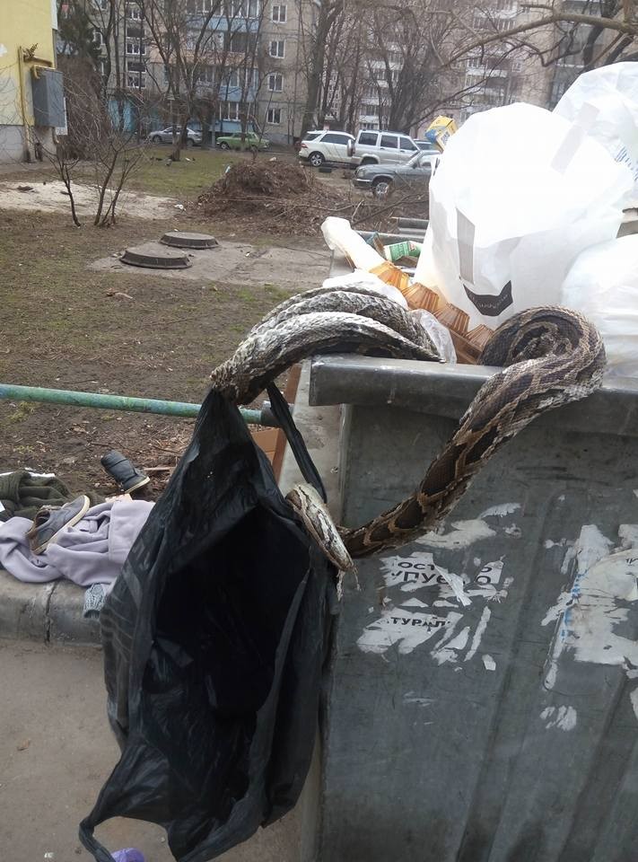 На Русанівці на вул. Ентузіастів перехожі виявили величезного мертвого удава, якого невідомі викинули просто в сміттєвий бак біля будинку №7/3.