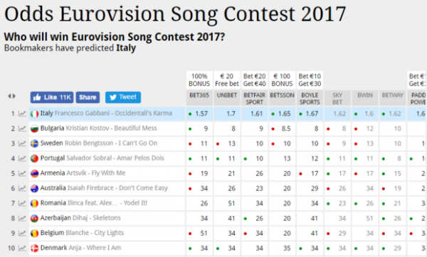 Незмінні перші чотири місця. Так, на думку букмекерів, у цьому році "Євробачення" може виграти представник Італії Francesco Gabbani. За ним слідують представники Болгарії, Швеції та Португалії.