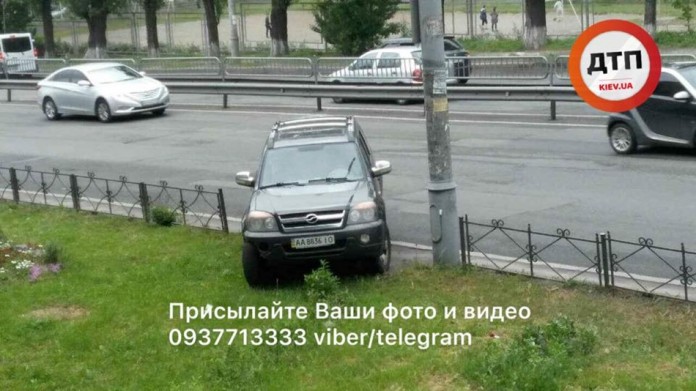 Так в Києві водій позашляховика припаркував свій автомобіль прямо на зеленій зоні між тротуаром і дорогою.