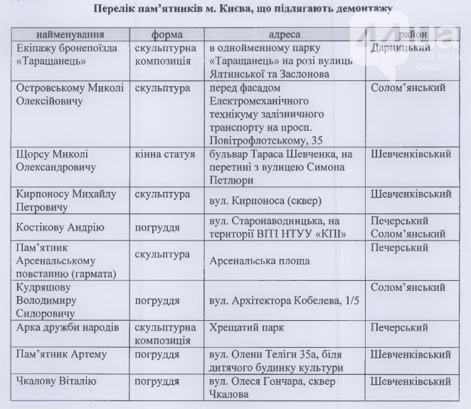 Серед них демонтажу підлягають: барельєф Більшовикам 1918 року в Печерському районі (завод Арсенал), барельєф Леніну на станції метро Театральна, а також пам'ятну дошку міністру оборони СРСР Андрію Гречко.