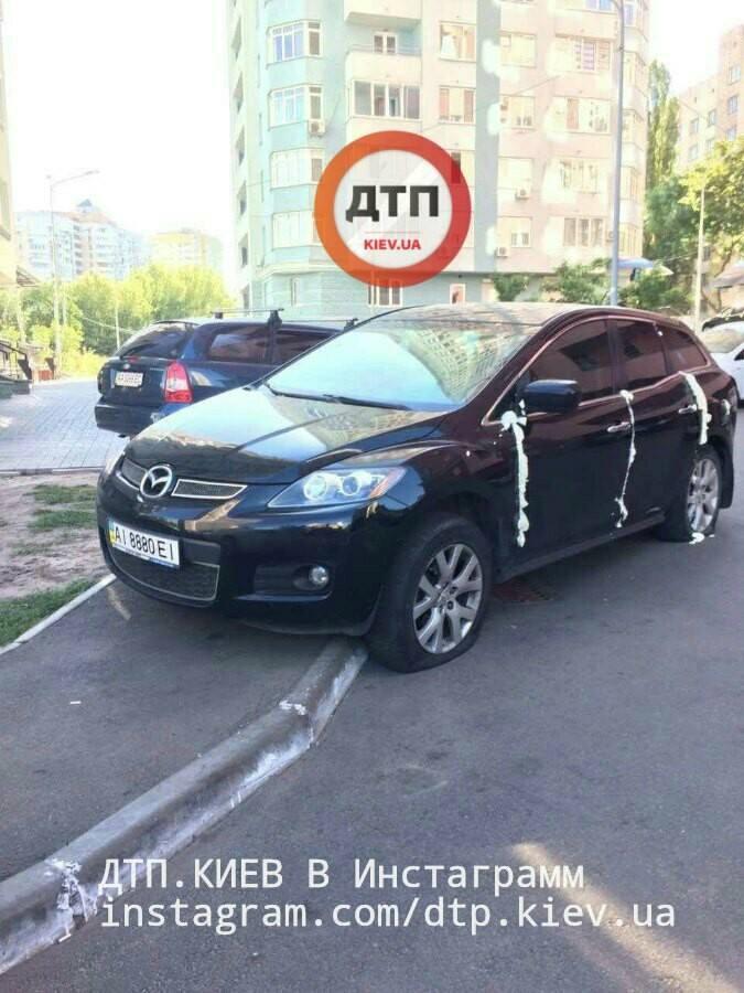 За інформацією «ДТП.КИЕВ» місцеві жителі покарали героя парковки за те, що він залишив свій кросовер на тротуарі, та ще й зі значним «виносом» корми на проїжджу частину.