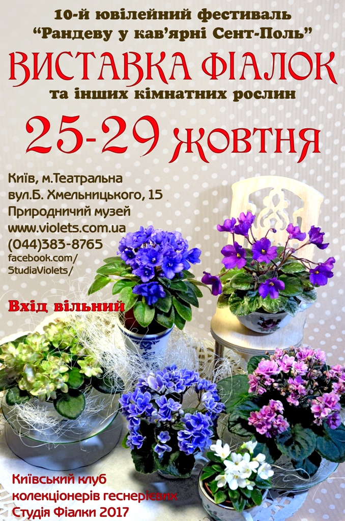 25-29 жовтня 2017 року у місті Київ, за адресою вул. Богдана Хмельницького 15 (Національний природознавчий музей НАН України, археологічний музей) відбудеться виставка фіалок та інших кімнатних рослин.
