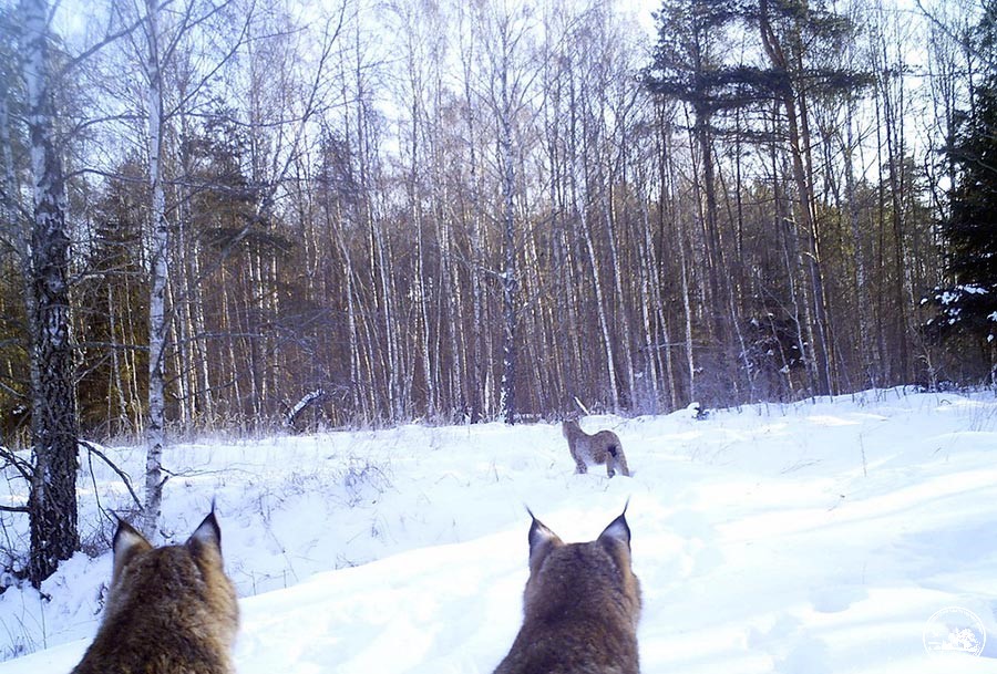Як видно зі світлини, трійко плямистих пухнастиків у пошуках їжі топтали сніг серед білого дня. Попереду в кадрі або мати, або найсміливіша рись з виводком.