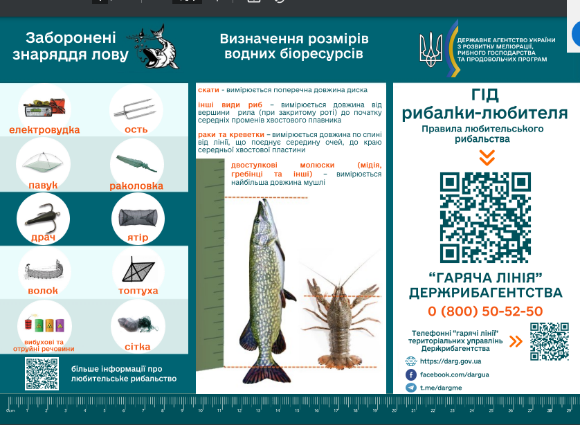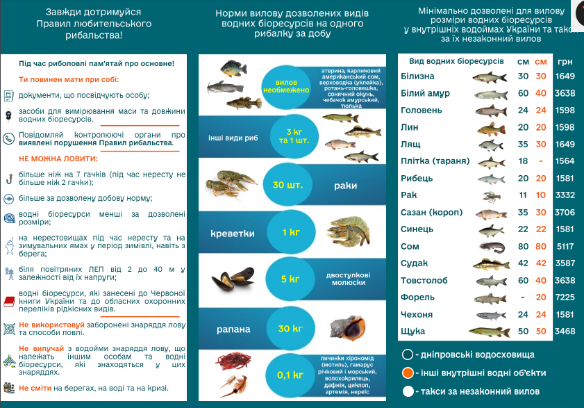 Основні вимоги Правил любительського рибальства можна переглянути у розробленому Держрибагентством ГІДі рибалки-любителя. У ньому відображено норми вилову дозволених видів водних біоресурсів, їх мінімально дозволені для вилову розміри, наведено перелік заборонених знарядь лову тощо.