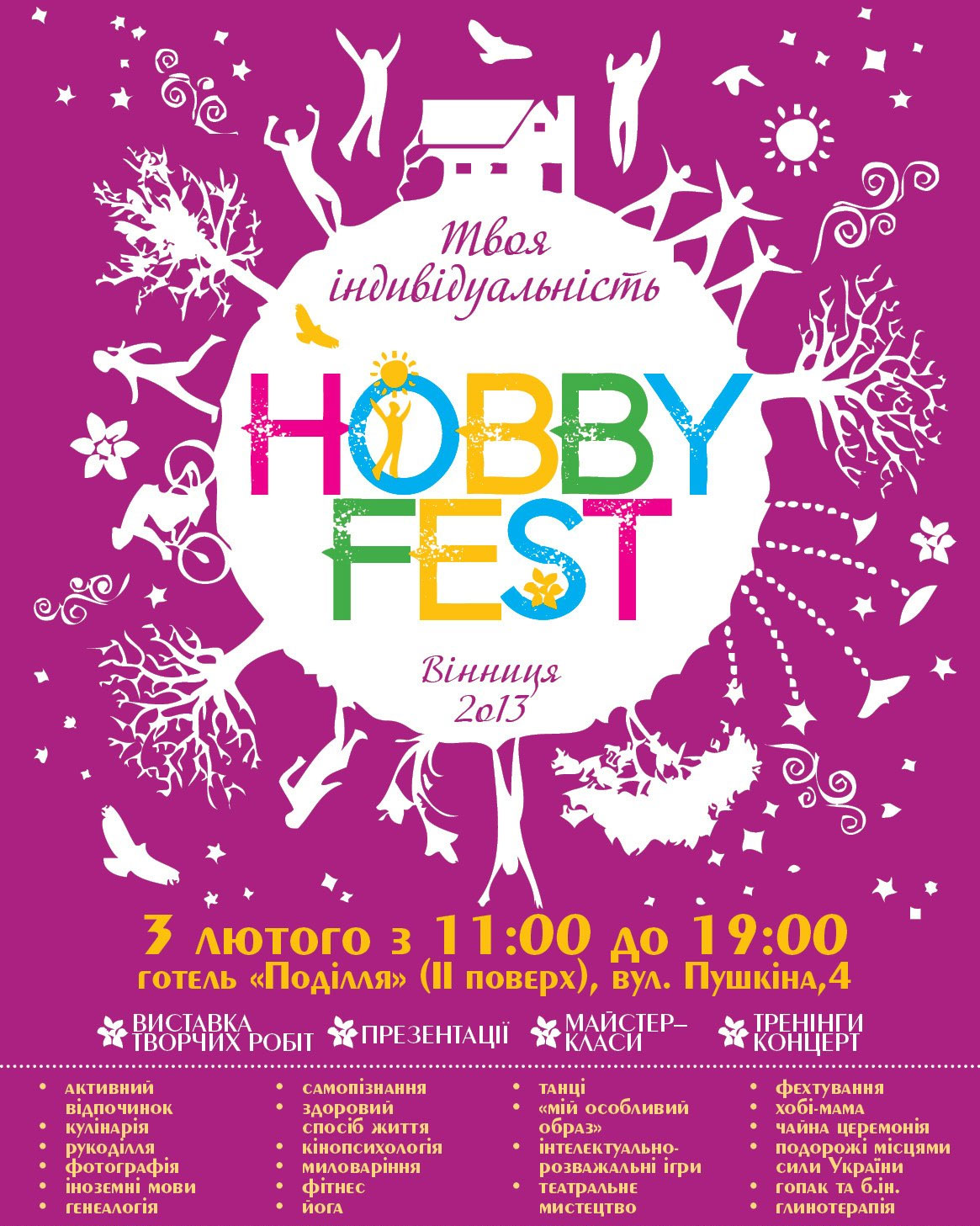 Перший Вінницький фестиваль захоплень "HobbyFEST - твоя індивідуальність" відбудеться 3 лютого з 11.00 до 19.00 у готелі "Поділля" на другому поверсі, де працюватиме три зали для майстер-класів та презентацій, а також у холі - виставка творчих робіт.