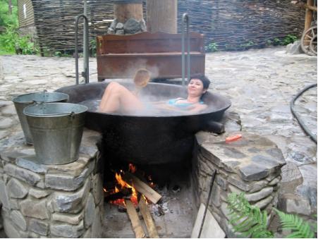 - Ви заходите до дерев’яної колиби, тільки без даху. Посередині, замість шинквасу, стоїть чавунна посудина, наповнена мінералкою. Її підігрівають дровами на відкритому вогні. В чані лежать кілька камінців. Ви залазите всередину (в цьому саморобному джакузі вміщуються інколи ще 4–5 людей), а меткий гуцул, котрий підкладає хмиз під чан, варить вас на повільному полум’ї. Як відчуєте, що кров починає кипіти (хоча насправді воду гріють не більше ніж до +45°C), вискакуйте! За кілька кроків — прохолодний гірський потік. І влітку, і взимку процедура відбувається просто неба.