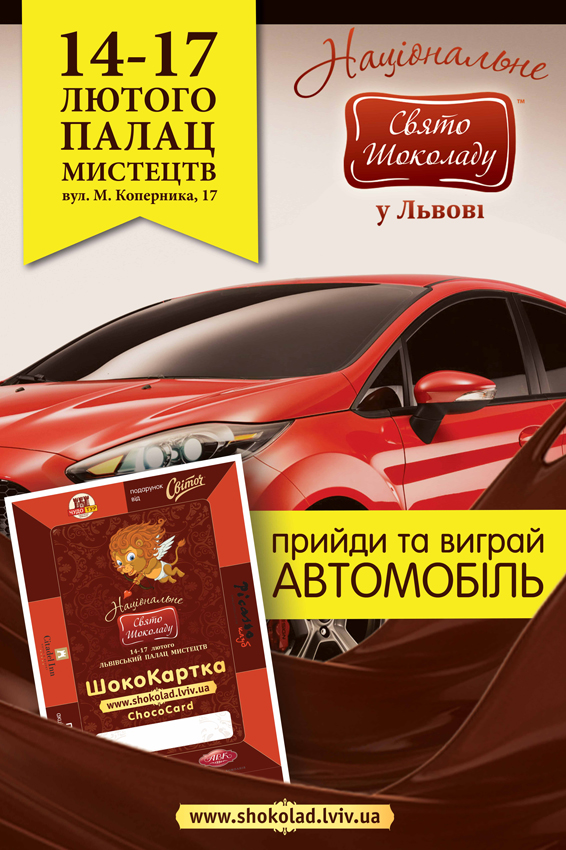 VI Національне Свято Шоколаду, яке відбудеться у Львівському палаці мистецтв 14-17 лютого, подарує автомобіль, не шоколадний, а справжній! Відтак, кожен власник вхідного квитка «ШокоКартки» бере участь у розіграші головного призу Свята - автомобіля!