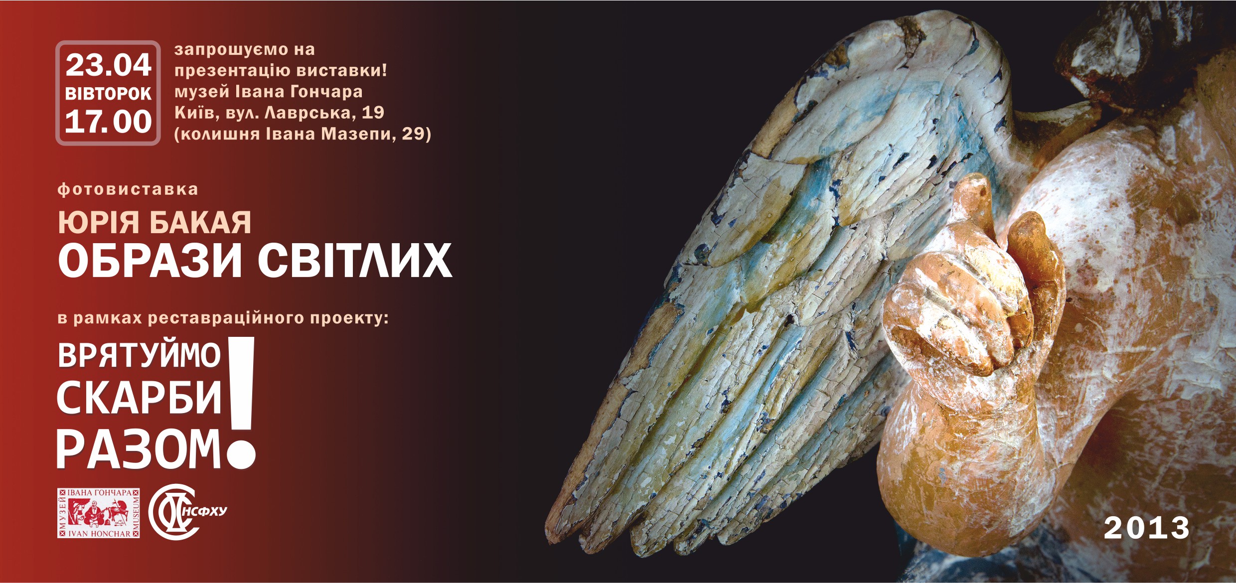 Ця фотовиставка – авторське бачення концепції реставраційного проекту «Врятуймо скарби разом!» із порятунку творів іконопису та скульптури з фондосховищ музеїв. Проект започатковано завідувачем відділу реставрації Івано-Франківського краєзнавчого музею Валерієм Твердохлібом. Національний центр народної культури «Музей Івана Гончара» – наступний музей, де зреалізуються ідеї проекту. З цією метою, працівники музею тематично підібрали з фондосховищ 14 творів, які перебувають в найбільш пошкодженому стані. Історія представлених творів цікава та драматична, прочитати її допомагає фотофіксація робіт на дореставраційному етапі, коли відбитки часу, павутина ще зберігають таємницю минулих століть. Після роботи реставратора ці знаки частково зникають, відкриваючи шлях власне повідомленню, що його несе мистецький твір.