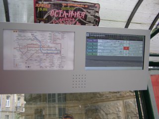 Перше таке табло встановлене на вул. Івана Франка на зупинці "Вулиця Саксаганського". Табло складається з двох екранів, на одному показано час, який залишається до прибуття трамвая на зупинку, на іншому - макет-схема руху електротранспорту.