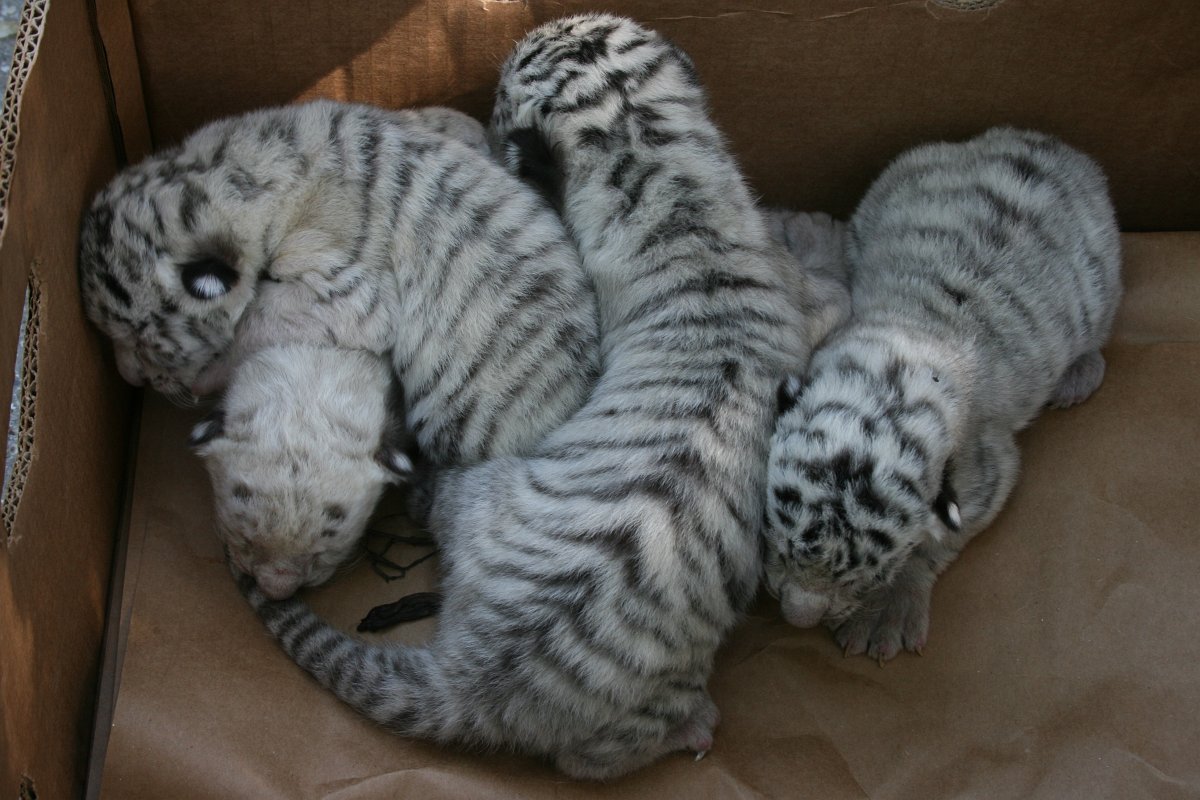 Всі з'явилися малюки здорові і добре їдять. Народилися 3 хлопчики і одна дівчинка. Один з тигрів практично не має чорних смужок, він білого кольору.