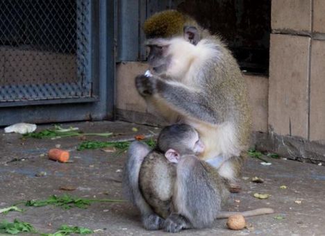 Маленька зелена мавпочка без мами не може лишитися ні на секунду. Навіть істерику влаштувати може. Наглядачі кажуть, що матір про дитину дбає, далеко від себе не відпускає. Проте вона при цьому мало не на шматки розривається. Бо, окрім догляду за найменшим, займається ще 4 дітьми від попереднього "шлюбу" і тричі на день виконує подружній обов'язок - вибирає чоловікові бліх. Добре, що найменший особливо не заважає: в основному спить і їсть, не злізаючи з неї.