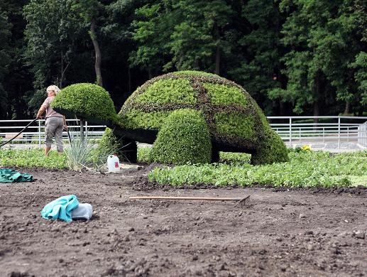 Розпочали створювати квітучу дивовижу ще у квітні. В об’ємний металевий каркас уже висадили рослини і завершують облаштування території навколо клумби. В усій красі черепаха постане до вихідних.