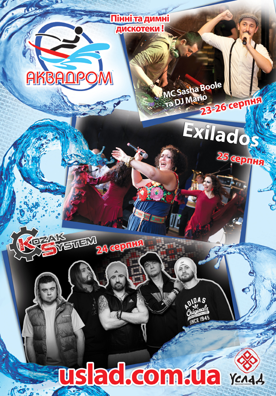 Вечірня музична програма від МС Sasha Boole та Dj зарядять публіку до танців. Дискотечні ритми цього дуету доповнить димне та пінне шоу на танц полі. Не пропустіть найгарячішої дискотеки літа у форматі «Аквадрому» на «Усладі»