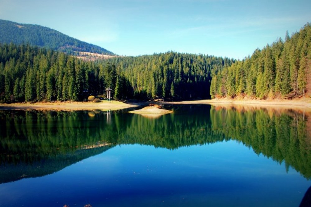 Сине вир - найбільше і найгарніше гірське озеро України. За свою оригінальну форму воно отримало ще одну назву - «Морське око». З висоти пташиного польоту озеро виглядає як бездоннє синєоко: навколо прозорої води - зелена гущавина лісів, а посередині водної гладі - маленький острівець.