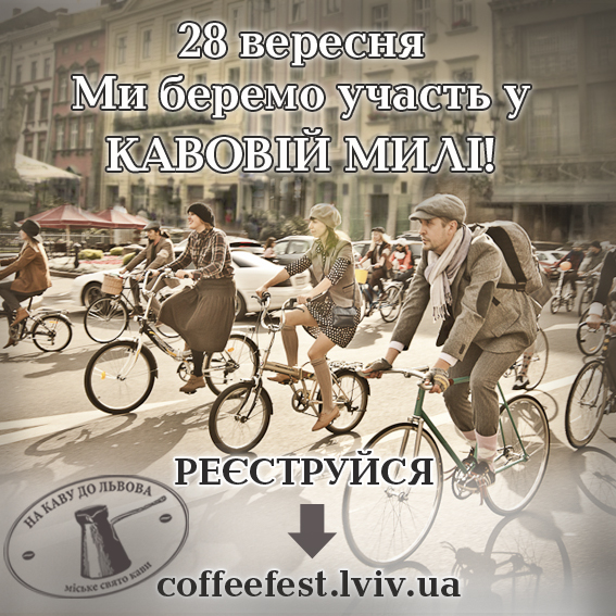 Свято «На каву до Львова» додає драйву! Відтак, 28 вересня в рамках VІІ Міського свята «На каву до Львова», відбудеться велопробіг «Кавова миля»! Участь можуть взяти усі охочі, хто має велосипед. Про це повідомляють організатори фесту.