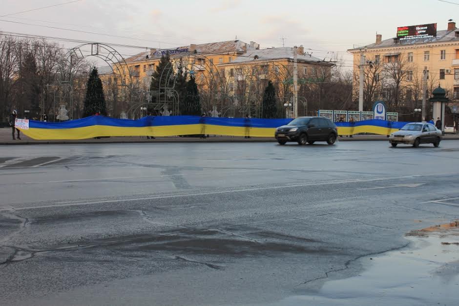 Під час чергового недільного Народного Віча у Луганську активісти "Громадянського сектору луганського Євромайдану" розгорнули 42-метровий прапор України вздовж проїжджої частини головної вулиці обласного центру.