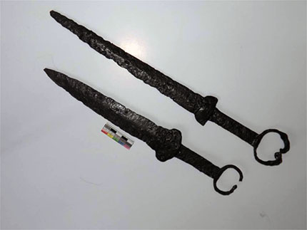 На превеликий жаль ми не маємо відомостей про те, з якої саме пам’ятки походять ці два експонати, та відомо, що вони, скоріше за все, знайдені на території Кам’янсько-Дніпровського району Запорізької області. Мечі та кинджали зустрічаються набагато рідше в похованнях, ніж наконечники стріл чи навершя списів. Зазвичай вони були серед поховального інвентарю в «царських» курганах або в похованнях більш-менш знатних воїнів. Кинджали, які надійшли до фондів, досить короткі, довжиною 40,5 та 33,5 см. представлені одним типом із метеликоподібним перехрестям та антенним навершям. Лезо симетричне, двосічне, ромбовидне в перетині. За аналогічними зразками зброї дані кинджали можна датувати VI–V ст. до н.е.