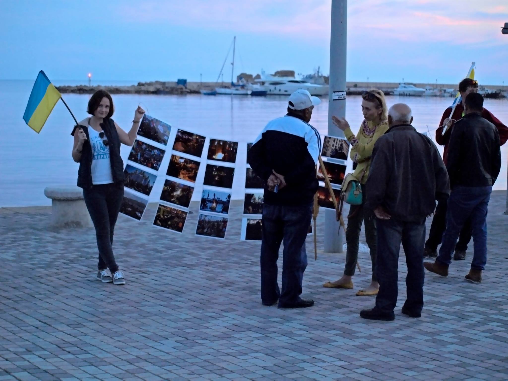 Кіпр. Пафос. Порт. Фотовиставка "Euromaidan-Ukraine". Виставку було вирішено розпочати о 17.30 на набережній Пафосу в порту. Перед цим в обід була розвідана ситуація в порту та вивчено стан набережної. Людей було не так і багато в денний час.