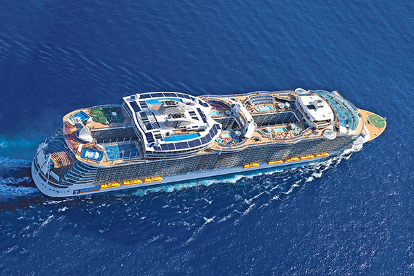 Гаргантанская Гармония морей Королевского Карибского моря в настоящее время обладает титулом крупнейшего в мире круизного судна с возможностью взять на борт более 6700 пассажиров.