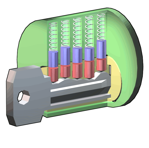 В замке на шпильке ряд подпружиненных штырей предотвращает поворот вилки. Вставляя ключ или открывая замок, вы поднимаете стаканы, чтобы очистить линию сдвига – там, где пробка встречается с цилиндром – и открывает замок. Таким образом, выбирая качественный замок, уличный вор не сможет его сломать, а настоящие профессионалы вряд ли станут воровать велосипеды.