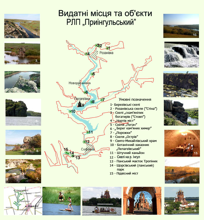 Окремі, найбільш примітні або мальовничі, виходи кристалічних порід отримали власні назви. Про деякі з них складено по декілька легенд, як, наприклад, про скелі над Інгулом «Пугач», «Стовп» (або «Скеля скам'янілих богатирів»), «Спляча красуня», «Стіна» поблизу від гирла Березівки, де вона впадає в Інгул. На південь від села Розанівка також є «Стіна» або «Воронова скеля», на якій здавна селиться пара воронів. Є ще два «Пугачі» — «Старий» та «Молодий». Є фантастично привабливі гранітні відслонення — «Берег кам'яних химер», гранітне плато у місці злиття річки Стовпової з Інгулом, що має назву «Чортів міст», а також інші.