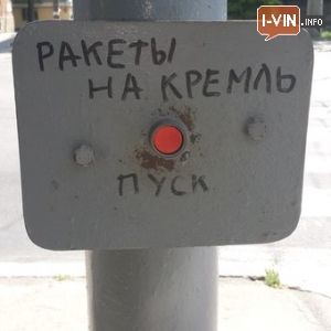 Хтось із вінничан написав чорним маркером на місці виклику зеленого світла для переходу дороги по вулиці Свердлова, що біля Воєнного госпіталю, «Ракети на Кремль. Пуск».