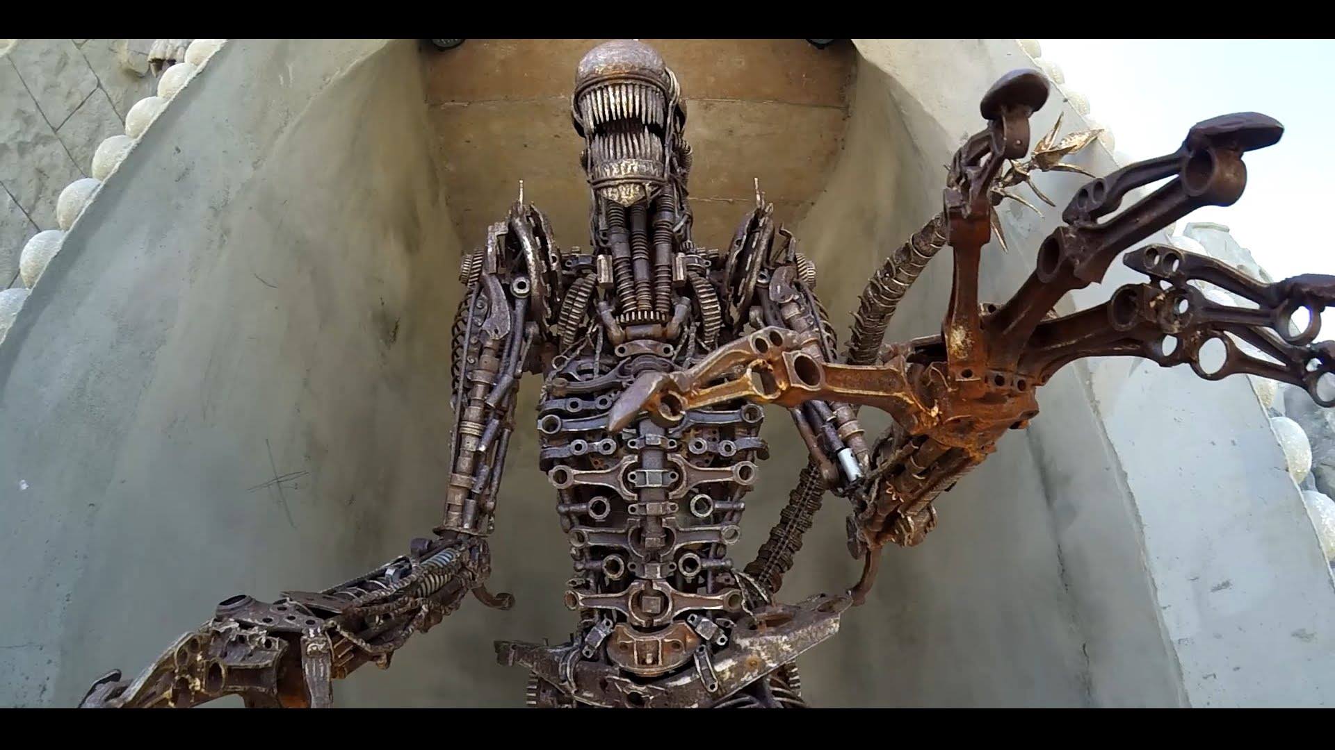 Ворота охороняють фігури, висотою в 3 метри - персонажі з фільмів Чужий і Хижак. Кам'яні склепіння, вузькі вікна і такі "охоронці" надають замку містичний вид. На шпилях є флюгера з фігурками орла, коня і лева.