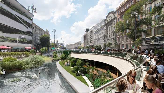За словами автора, проїжджу частину вулиці Хрещатик можна віддати під річку, а пішохідну – замінити зоною для відпочинку.